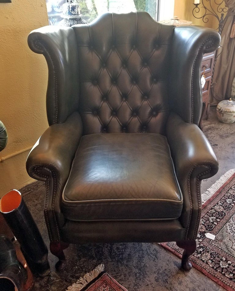 Pair Of Leather Chesterfield Queen Ann Style Wing Back Armchairs At 1stdibs