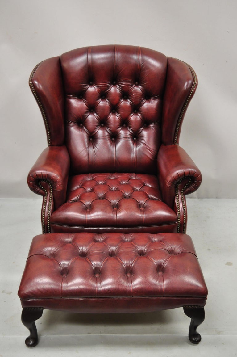 Vintage English Chesterfield Burgundy Leather Tufted Wingback Chair And Ottoman At 1stdibs